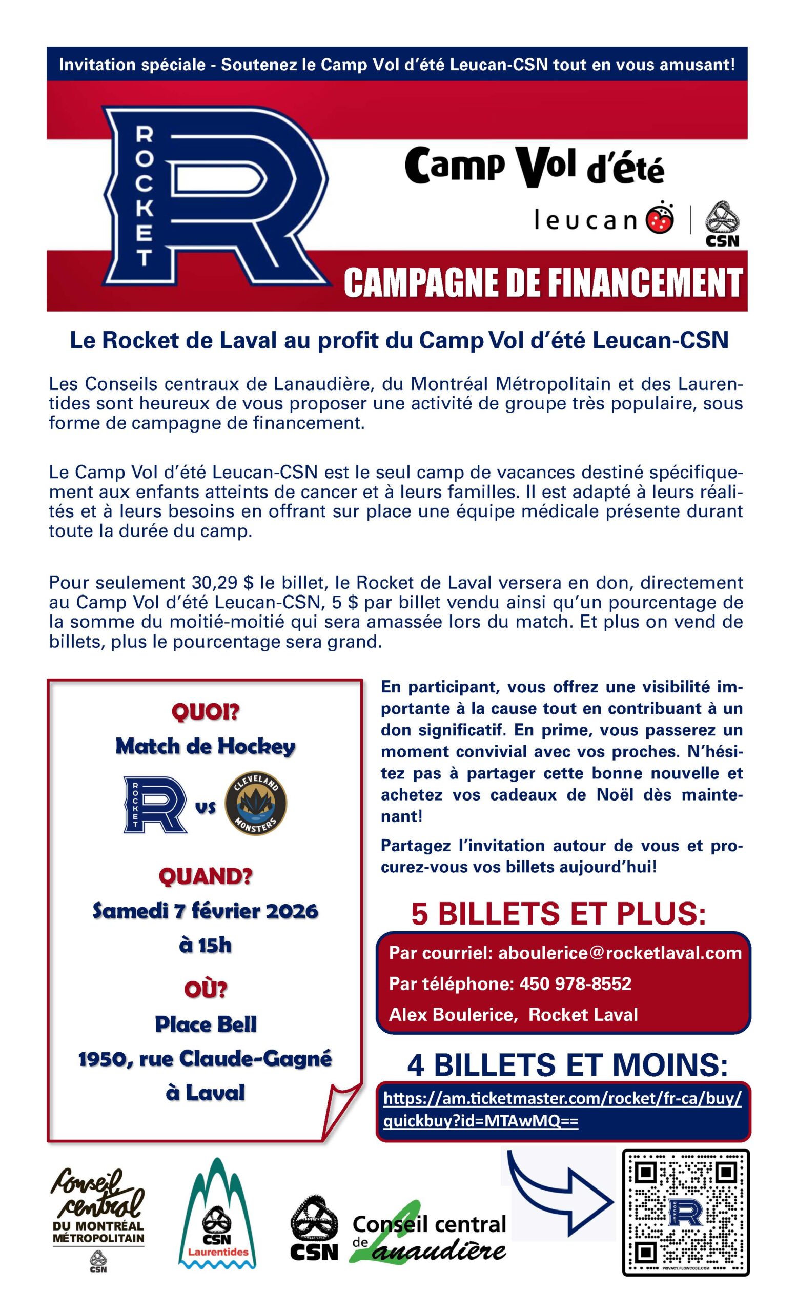 Pour seulement 30,29 $ le billet, le Rocket de Laval versera en don, directement au Camp Vol d’été Leucan-CSN, 5 $ par billet vendu ainsi qu’un pourcentage de la somme du moitié-moitié qui sera amassée lors du match. Et plus on vend de billets, plus le pourcentage sera grand.